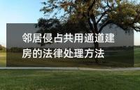邻居侵占共用通道建房的法律处理方法。根据《中华人民共和国物权法》的规定,邻居侵占公用通道建房是侵害他人权益的行为,被侵害人有权起诉要求恢复原状并赔偿损失。同时,相邻关系处理应遵循有利生产、方便生活等原则,业主应遵守法律、法规及管理规约,对损害他人合法
